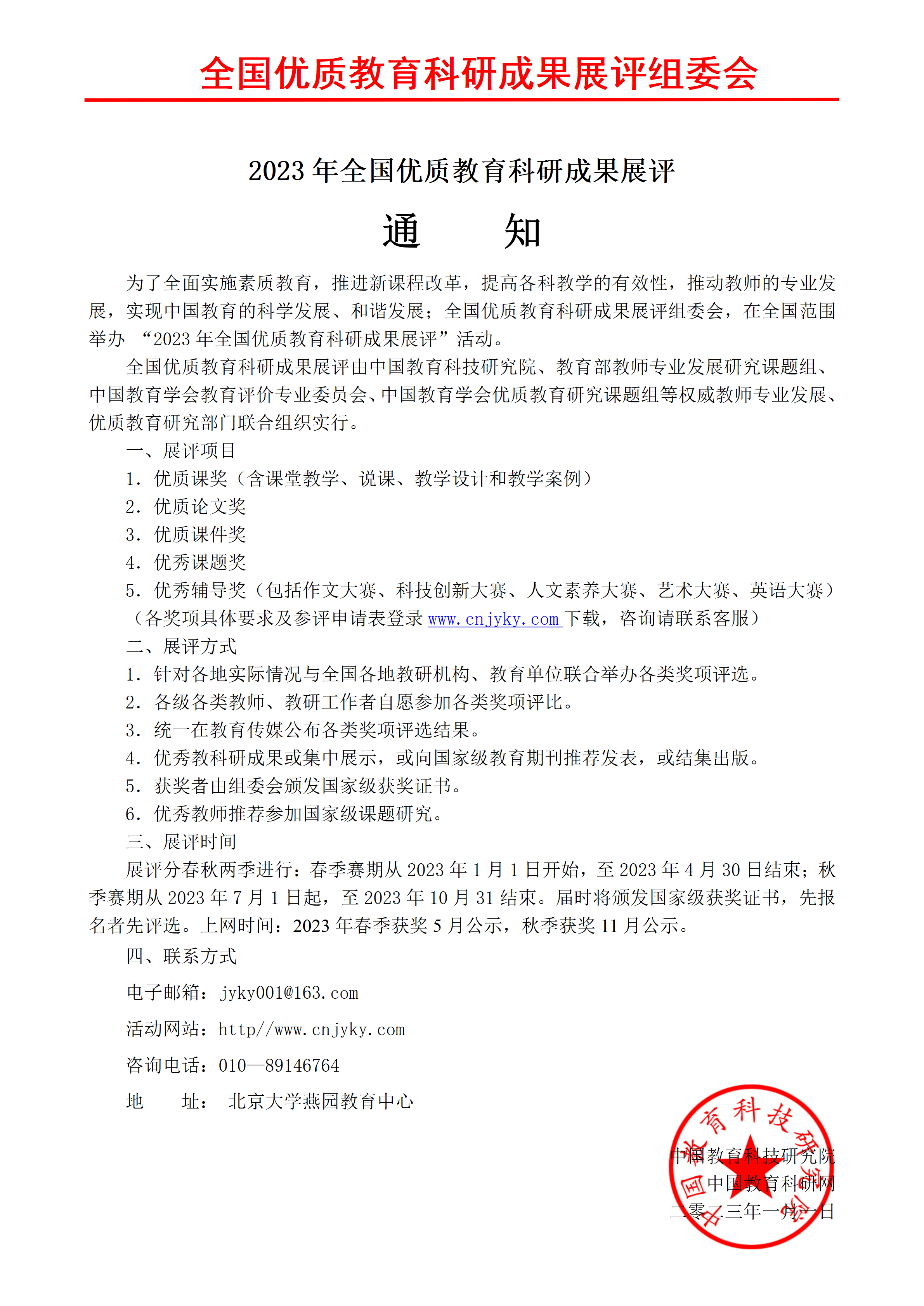| 2023年全国优质教育科研成果展评 通 知 为了全面实施素质教育,推进新课程改革,提高各科教学的有效性,推动教师的专业发展,实现中国教育的科学发展、和谐发展;全国优质教育科研成果展评组委会,在全国范围举办 “2023年全国优质教育科研成果展评”活动。 全国优质教育科研成果展评由中国教育科技研究院、教育部教师专业发展研究课题组、中国教育学会教育评价专业委员会、中国教育学会优质教育研究课题组等权威教师专业发展、优质教育研究部门联合组织实行。 一、展评项目 1.优质课奖(含课堂教学、说课、教学设计和教学案例) 2.优质论文奖 3.优质课件奖 4.优质课题奖 5.优秀辅导奖(包括作文大赛、科技创新大赛、人文素养大赛、艺术大赛、英语大赛) (各奖项具体要求及参评申请表登录www.cnjyky.com下载,咨询请联系客服) 二、展评方式 1.针对各地实际情况与全国各地教研机构、教育单位联合举办各类奖项评选。 2.各级各类教师、教研工作者自愿参加各类奖项评比。 3.统一在教育传媒公布各类奖项评选结果。 4.优秀教科研成果或集中展示,或向国家级教育期刊推荐发表,或结集出版。 5.获奖者由组委会颁发国家级获奖证书。 6.优秀教师推荐参加国家级课题研究。 三、展评时间 展评分春秋两季进行:春季赛期从2023年1月1日开始,至2023年4月30日结束;秋季赛期从2023年7月1日起,至2023年10月31结束。届时将颁发国家级获奖证书,先报名者先评选。上网时间:2023年春季获奖5月公示,秋季获奖11月公示。 四、联系方式 电子邮箱:jyky001@163.co 活动网站:http//www.cnjyky.com 咨询电话:010—89146764 地 址: 北京大学燕园教育中心