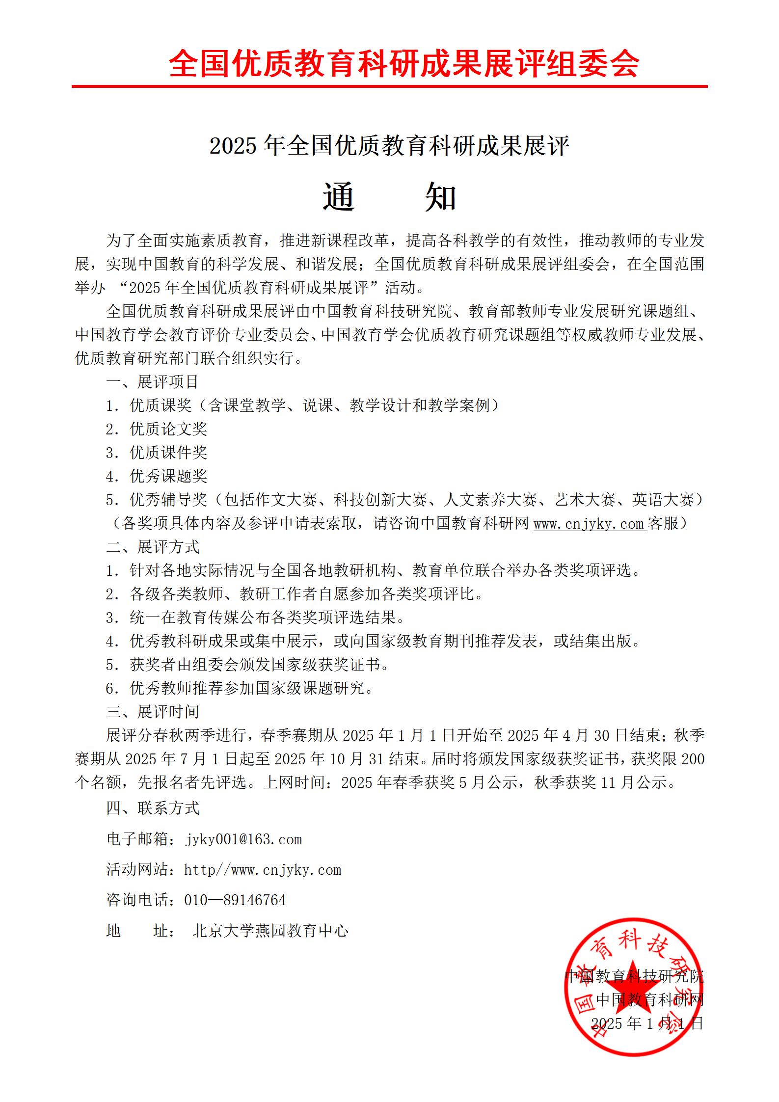 | 2025年全国优质教育科研成果展评 通 知 为了全面实施素质教育,推进新课程改革,提高各科教学的有效性,推动教师的专业发展,实现中国教育的科学发展、和谐发展;全国优质教育科研成果展评组委会,在全国范围举办 “2025年全国优质教育科研成果展评”活动。 全国优质教育科研成果展评由中国教育科技研究院、教育部教师专业发展研究课题组、中国教育学会教育评价专业委员会、中国教育学会优质教育研究课题组等权威教师专业发展、优质教育研究部门联合组织实行。 一、展评项目 1.优质课奖(含课堂教学、说课、教学设计和教学案例) 2.优质论文奖 3.优质课件奖 4.优质课题奖 5.优秀辅导奖(包括作文大赛、科技创新大赛、人文素养大赛、艺术大赛、英语大赛) (各奖项具体要求及参评申请表登录www.cnjyky.com下载,咨询请联系客服) 二、展评方式 1.针对各地实际情况与全国各地教研机构、教育单位联合举办各类奖项评选。 2.各级各类教师、教研工作者自愿参加各类奖项评比。 3.统一在教育传媒公布各类奖项评选结果。 4.优秀教科研成果或集中展示,或向国家级教育期刊推荐发表,或结集出版。 5.获奖者由组委会颁发国家级获奖证书。 6.优秀教师推荐参加国家级课题研究。 三、展评时间 展评分春秋两季进行:春季赛期从2025年1月1日开始,至2025年4月30日结束;秋季赛期从2025年7月1日起,至2025年10月31结束。届时将颁发国家级获奖证书,先报名者先评选。上网时间:2025年春季获奖5月公示,秋季获奖11月公示。 四、联系方式 电子邮箱:jyky001@163.co 活动网站:http//www.cnjyky.com 咨询电话:010—89146764 地 址: 北京大学燕园教育中心